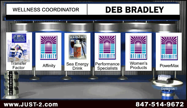 Contact: Debra Bradley www.just-2.com Wellness Coordinator eMail: dbradley4life@aol.com Phone: 847-514-9672